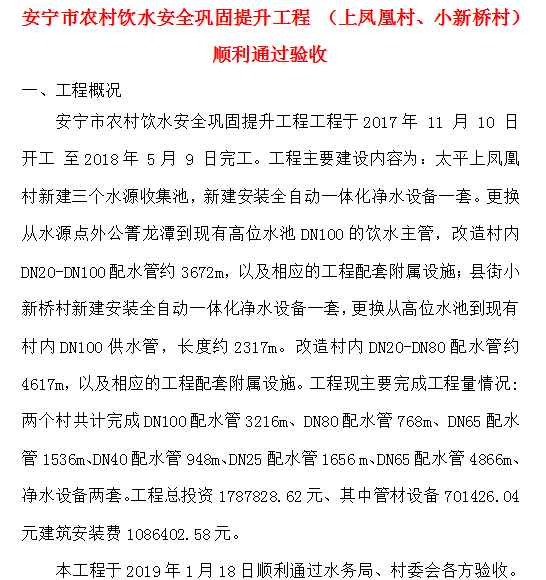 安寧市農村飲水安全鞏固提升工程 (上鳳凰村、小新橋村)順利通過驗收
