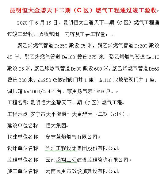 昆明恒大金碧天下二期(C區(qū))燃?xì)夤こ掏ㄟ^(guò)竣工驗(yàn)收