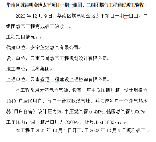 華南區(qū)域昆明金地太平項目一期一組團、二組團燃氣工程通過竣工驗收