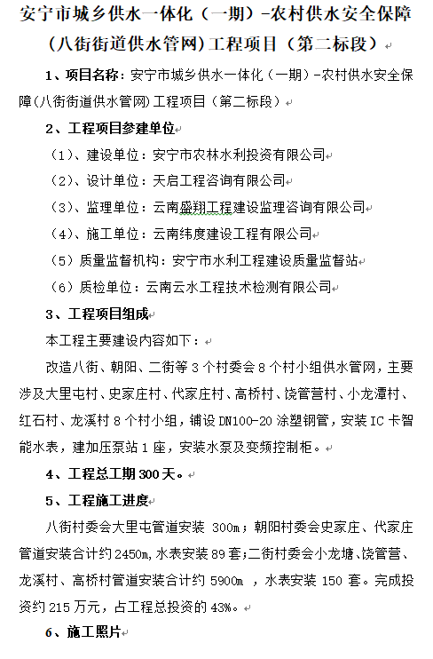 安寧市城鄉(xiāng)供水一體化(一期)-農(nóng)村供水安全保障(八街街道供水管網(wǎng))工程項目(第二標(biāo)段)