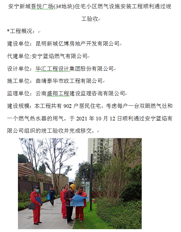 安寧新城吾悅廣場(3#地塊)住宅小區(qū)燃氣設(shè)施安裝工程順利通過竣工驗收
