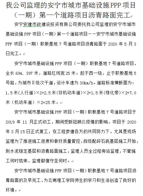 我公司監(jiān)理的安寧市城市基礎(chǔ)設(shè)施PPP項目(一期)第一個道路項目瀝青路面完工