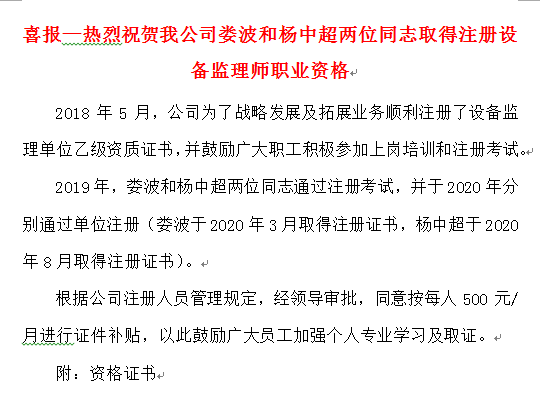 喜報(bào)—熱烈祝賀我公司婁波和楊中超兩位同志取得注冊(cè)設(shè)備監(jiān)理師職業(yè)資格