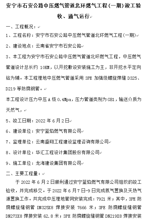 安寧市石安公路中壓燃?xì)夤艿辣杯h(huán)燃?xì)夤こ?一期)竣工驗(yàn)收、通氣運(yùn)行