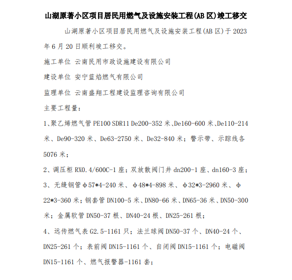 山湖原著小區(qū)項目居民用燃氣及設施安裝工程(AB區(qū))竣工移交