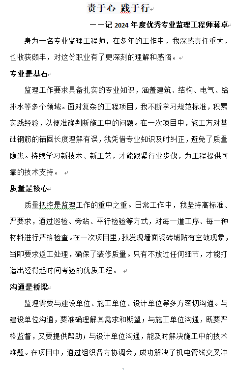 責(zé)于心 踐于行 ——記2024年度優(yōu)秀專業(yè)監(jiān)理工程師蔣卓