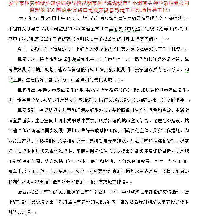 安寧市住房和城鄉(xiāng)建設局領導攜昆明市創(chuàng)“海綿城市”小組有關領導親臨我公司監(jiān)理的320國道金方路口至湖東路口改造工程現(xiàn)場指導工作