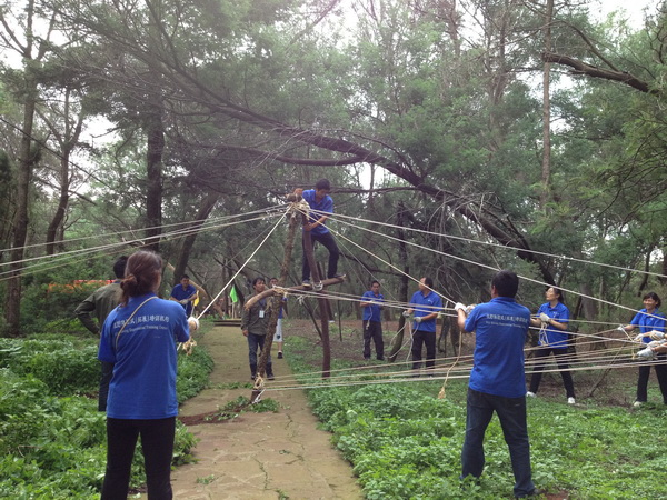 ??????? “穿越曲徑”:三根木頭,很多的繩子,木頭允許有兩個(gè)支點(diǎn),需要承載一個(gè)人走過彎曲的路徑到過目的地,其它的隊(duì)員須離木頭四米遠(yuǎn)。
