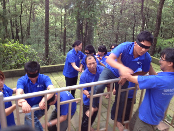 ??????? “信任后倒”:有一名隊(duì)員背對(duì)著團(tuán)隊(duì)站在1.5米高的站臺(tái)上,在充分信認(rèn)隊(duì)友的前提下,綁住雙手、蒙住眼睛筆直往后倒。其它隊(duì)員弓子步相對(duì)膝蓋對(duì)膝蓋,雙手水平抬起肩并肩組成平行“人床”齊力接住上面倒下的隊(duì)友。