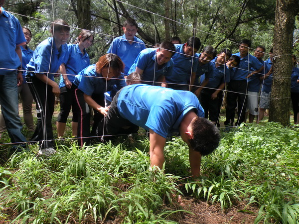 ??????? “生命之旅”:25名成員全部脫掉鞋襪、蒙上雙眼,不允許發(fā)出任何聲音,由教練選出12名成員解掉蒙著眼睛的布條,為還在蒙著雙眼的隊(duì)員引路,這樣的旅程很艱苦,需要走過荊棘、爬上高坑、攀登石蹲。