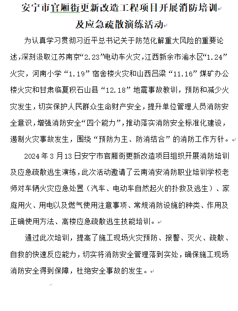 安寧市官廂街更新改造工程項(xiàng)目開(kāi)展消防培訓(xùn)及應(yīng)急疏散演練活動(dòng)