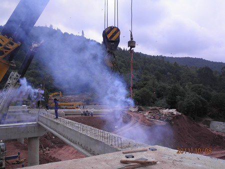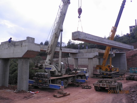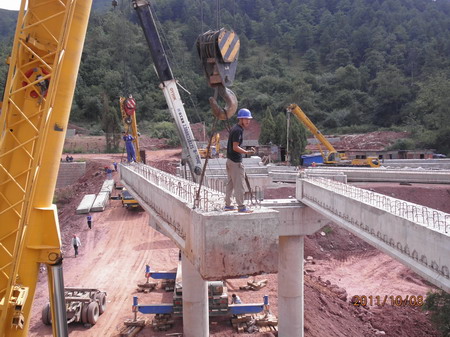 安化廠區(qū)大橋于2011年10月8日吊裝成功,大橋造價(jià)368萬(wàn),橋長(zhǎng)57.9米,4跨,中橋上部為7米現(xiàn)澆實(shí)心板+2*20米裝配式預(yù)應(yīng)力混凝土簡(jiǎn)支空心板橋+7米預(yù)制空心板結(jié)構(gòu)簡(jiǎn)支橋面連續(xù)梁橋。