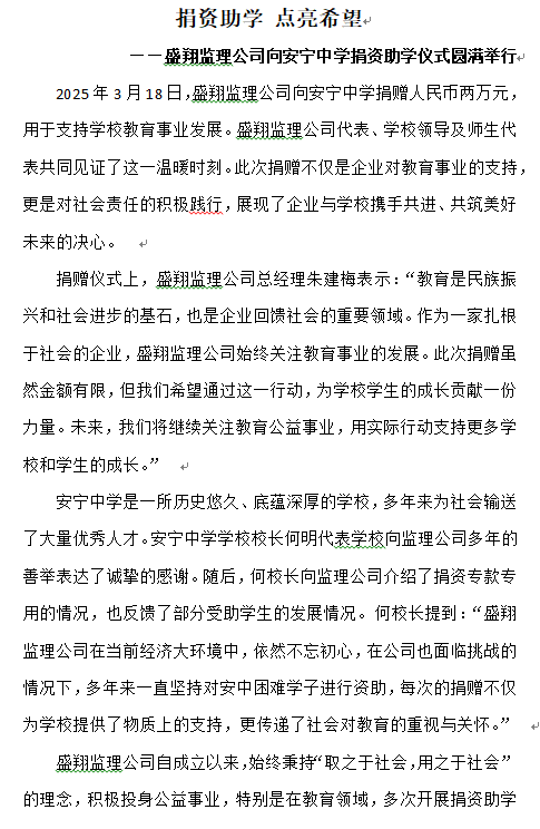 捐資助學(xué) 點亮希望 ——盛翔監(jiān)理公司向安寧中學(xué)捐資助學(xué)儀式圓滿舉行