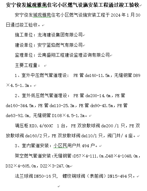 安寧俊發(fā)城觀雅苑住宅小區(qū)燃氣設施安裝工程通過竣工驗收