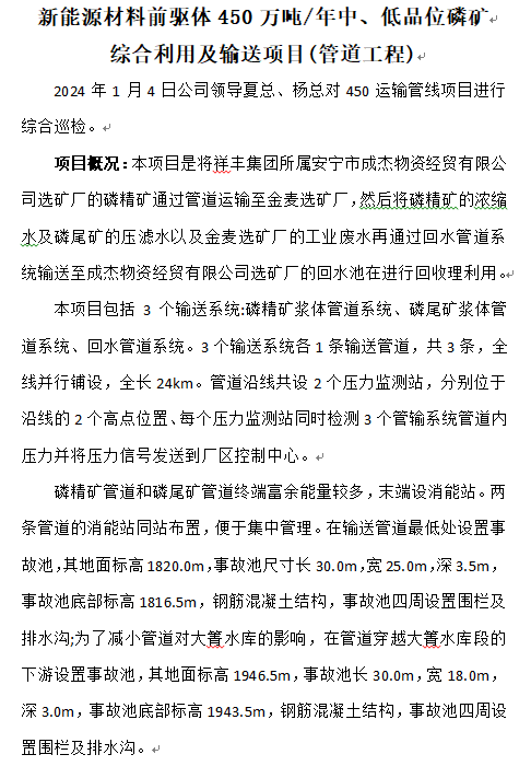 新能源材料前驅(qū)體450萬噸/年中、低品位磷礦綜合利用及輸送項目(管道工程)