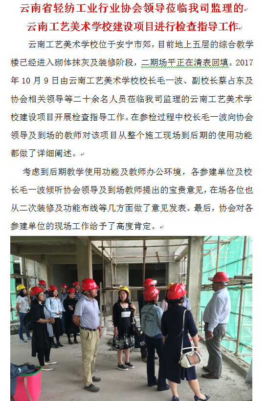 云南省輕紡工業(yè)行業(yè)協(xié)會領(lǐng)導(dǎo)蒞臨我司監(jiān)理的云南工藝美術(shù)學(xué)校建設(shè)項目進行檢查指導(dǎo)工作
