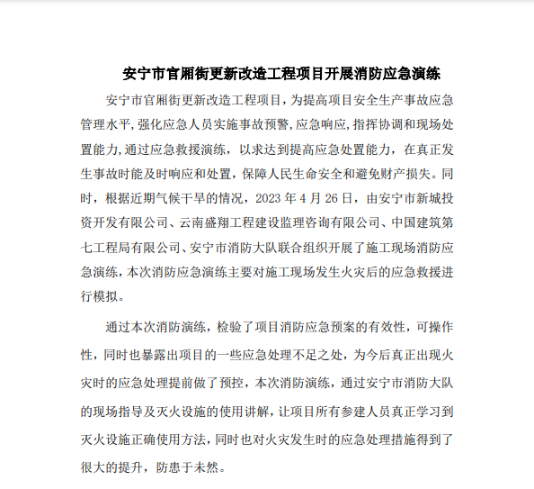 安寧市官廂街更新改造工程項(xiàng)目開展消防應(yīng)急演練