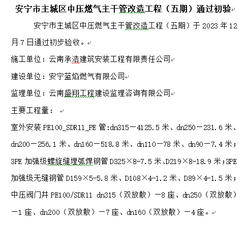 安寧市主城區(qū)中壓燃?xì)庵鞲晒芨脑旃こ蹋ㄎ迤冢┩ㄟ^初驗