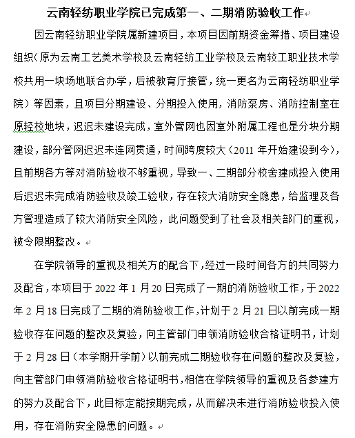云南輕紡職業(yè)學(xué)院已完成第一、二期消防驗(yàn)收工作