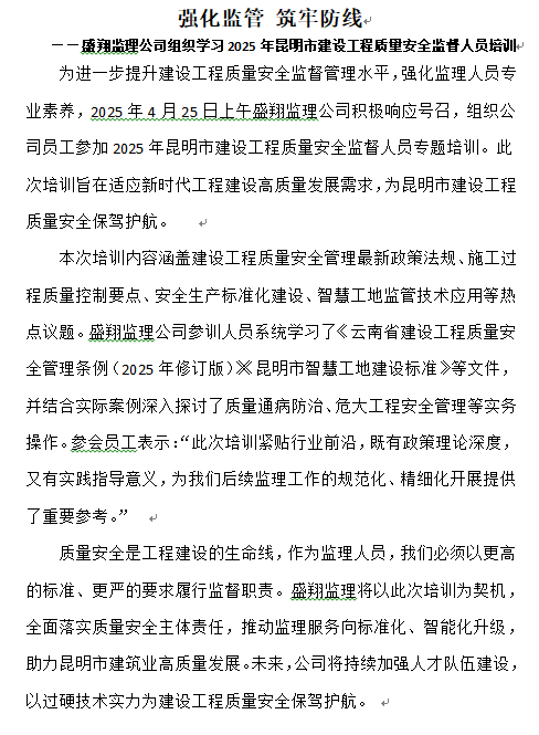 強(qiáng)化監(jiān)管 筑牢防線 ——盛翔監(jiān)理公司組織學(xué)習(xí)2025年昆明市建設(shè)工程質(zhì)量安全監(jiān)督人員培訓(xùn)