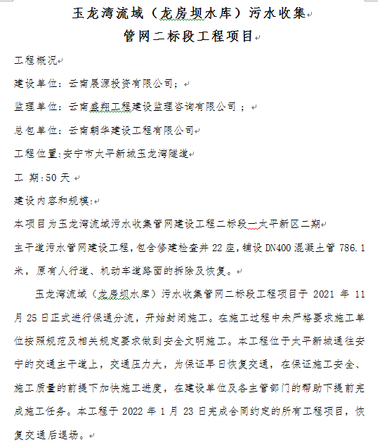 玉龍灣流域(龍房壩水庫)污水收集 管網(wǎng)二標(biāo)段工程項目