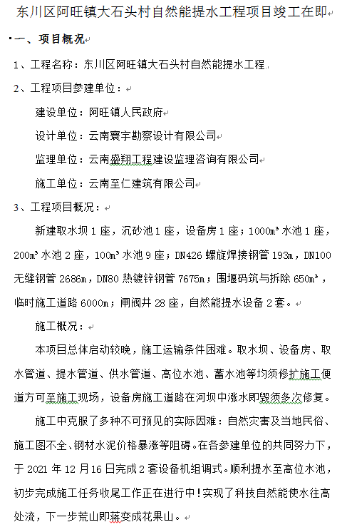 東川區(qū)阿旺鎮(zhèn)大石頭村自然能提水工程項目竣工在即