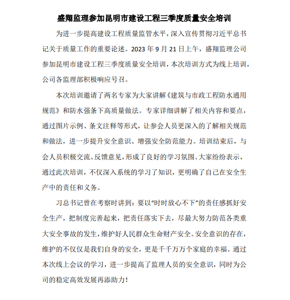 盛翔監(jiān)理參加昆明市建設工程三季度質(zhì)量安全培訓
