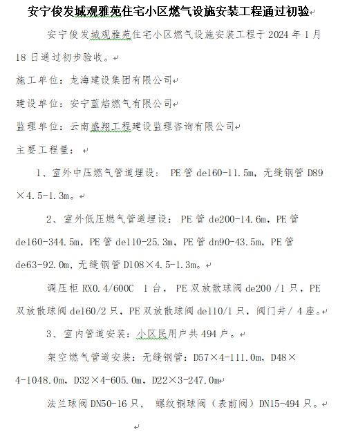 安寧俊發(fā)城觀雅苑住宅小區(qū)燃?xì)庠O(shè)施安裝工程通過初驗(yàn)