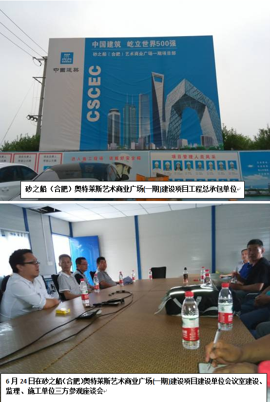 6月24日16:00點,我們來到了安徽合肥砂之船工程施工工地,參觀了由中國建筑承建的砂之船(合肥)奧特萊斯藝術(shù)商業(yè)廣場(一期)建設(shè)項目工程,我就對砂之船(合肥)奧特萊斯藝術(shù)商業(yè)廣場(一期)建設(shè)項目工程的參觀學(xué)習(xí)后談?wù)勛约旱母惺堋?/span>
