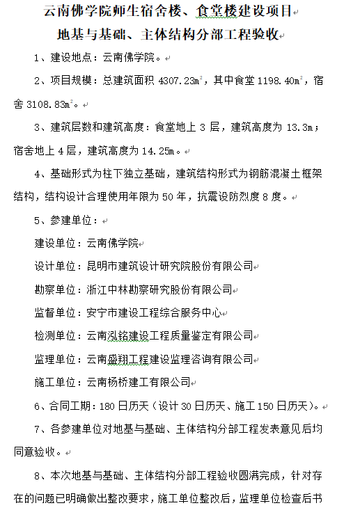 云南佛學(xué)院師生宿舍樓、食堂樓建設(shè)項(xiàng)目 地基與基礎(chǔ)、主體結(jié)構(gòu)分部工程驗(yàn)收