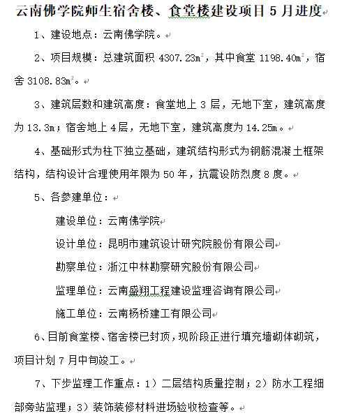 云南佛學院師生宿舍樓、食堂樓建設(shè)項目5月進度