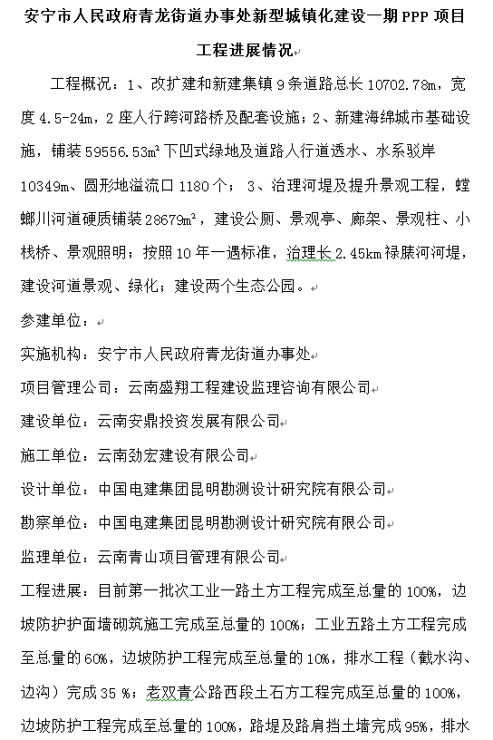 安寧市人民政府青龍街道辦事處新型城鎮(zhèn)化建設(shè)一期PPP項(xiàng)目 工程進(jìn)展情況
