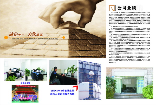 幾年來,我公司力求“以質(zhì)量求生存,以信譽求發(fā)展”的宗旨服務(wù)于社會,在社會各屆的大力支持和廣大工程技術(shù)人員的辛勤工作下,測繪項目遍及云南省各地區(qū),為云南省地方建設(shè)做出了積極的貢獻。在今后的工作中,公司依靠“信守合同、科技領(lǐng)先”的經(jīng)營理念,不斷提高測繪水平,以一流的測繪成果服務(wù)客戶,以一流的測繪業(yè)績奉獻社會。