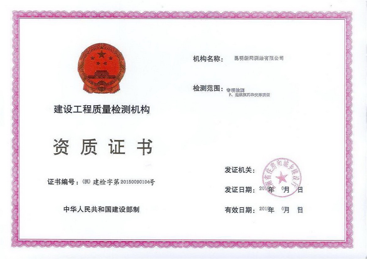 公司2005年5月取得云南省測繪局丙級資質(zhì),2014年4月取得國家乙級測繪資質(zhì)證書,證號:乙測資字53100014號,2016年6月取得云南住房和城鄉(xiāng)建設(shè)廳:建設(shè)工程質(zhì)量檢測資質(zhì)證書,證號:建檢字第20150090104號,公司經(jīng)營范圍:地理信息系統(tǒng)工程、工程測量、不動產(chǎn)測繪(房產(chǎn)測繪、地籍測繪)、工程檢測。