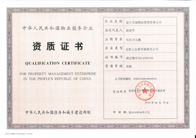 安寧興城物業(yè)管理有限公司是一家以向業(yè)主和物業(yè)使用人提供物業(yè)管理,不斷改善和提高社區(qū)及物業(yè)項目管理質(zhì)量,滿足業(yè)主生活和工作需求,“用心管理”的物業(yè)管理企業(yè),于2005年7月組建成立,具有安寧市建設(shè)局頒發(fā)的三級物業(yè)管理資質(zhì)證書,被2008年被推選為安寧市物業(yè)管理協(xié)會常務理事單位,2013年推選為安寧市物業(yè)管理協(xié)會會長單位至今。