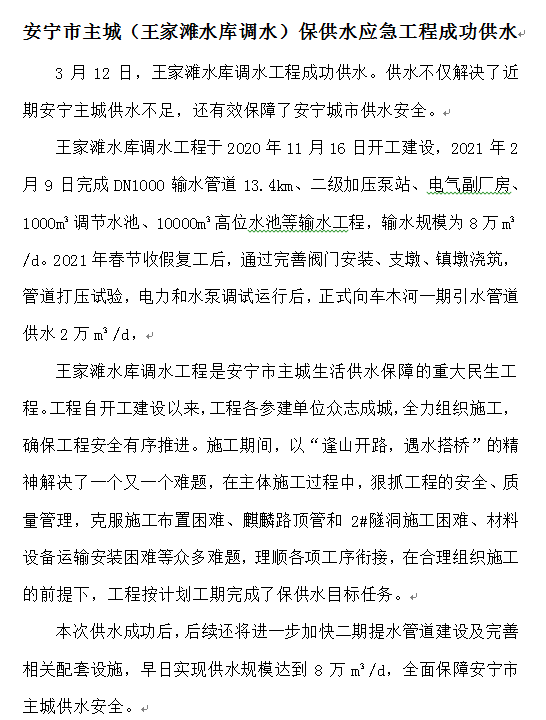 安寧市主城(王家灘水庫調(diào)水)保供水應(yīng)急工程成功供水